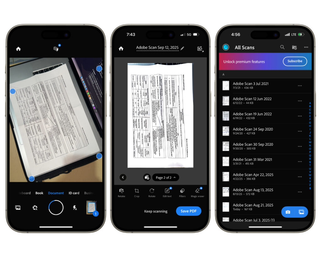 With Adobe Scan, I just point my camera at a paper and it turns into a clean PDF in seconds. It auto-detects the edges, fixes the angle, and makes it look like I used a real scanner. Even if I’m sloppy, the result is neat. Then I just send it to my email or save it in the cloud.