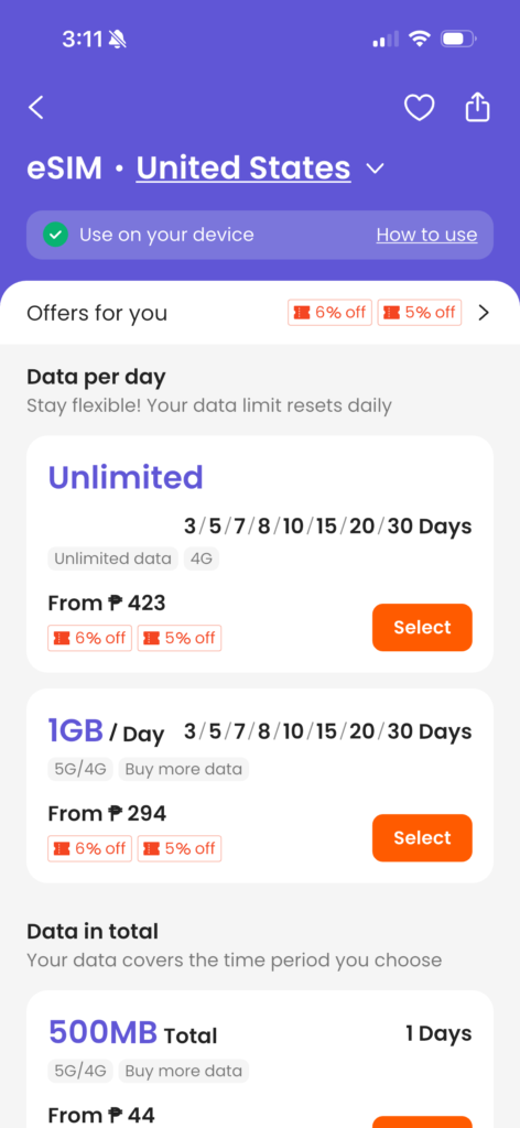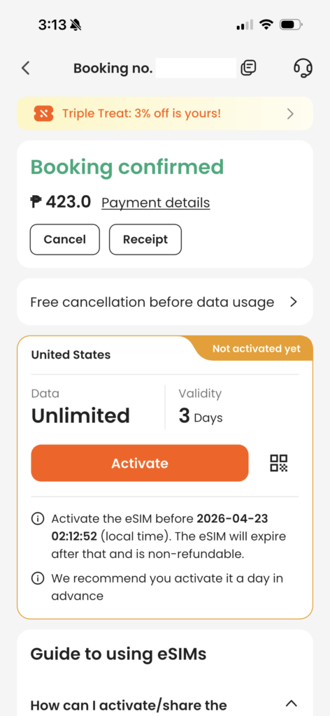 That’s why I’ve been looking into Klook’s eSIM feature. I first heard about eSIMs while prepping for this move. Basically, it’s a digital SIM that you install straight onto your phone, no need for a physical card. For the US, Klook has a package under AT&T service that costs Php 423 for three days. That’s perfect for me because it’ll cover my layover, my connecting flight, and a few hours before I can grab a Verizon SIM in Missouri. Feels like a tiny hack but a really useful one.